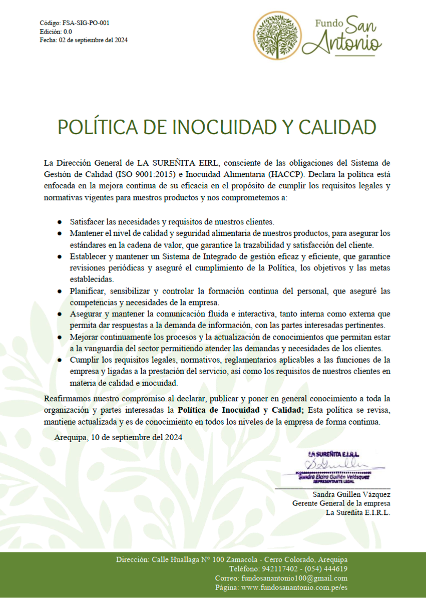 La Dirección General de LA SUREÑITA EIRL, consciente de las obligaciones del Sistema de Gestión de Calidad (ISO 9001:2015) e Inocuidad Alimentaria (HACCP). Declara la política está enfocada en la mejora continua de su eficacia en el propósito de cumplir los requisitos legales y normativas vigentes para nuestros productos y nos comprometemos a: